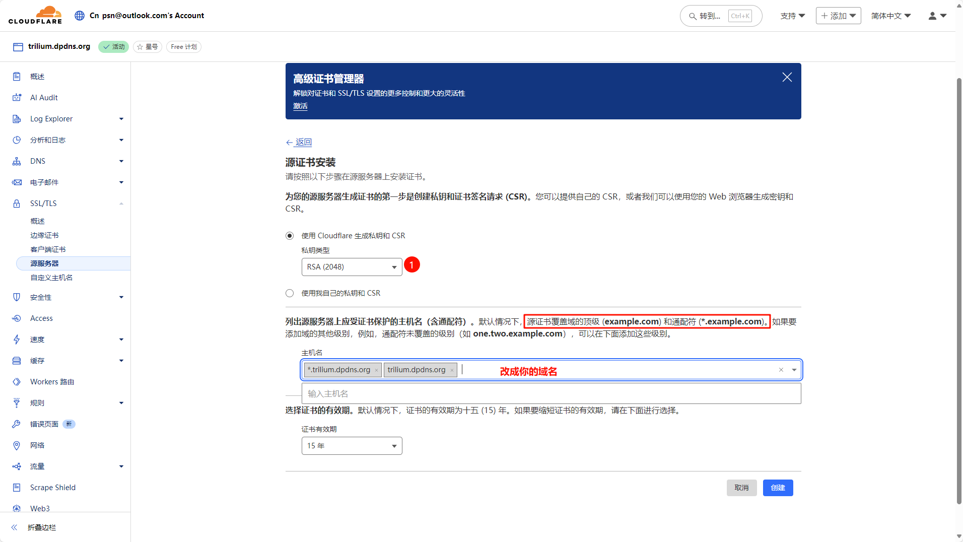 登录 Cloudflare → SSL/TLS → 源服务器 → 创建证书
