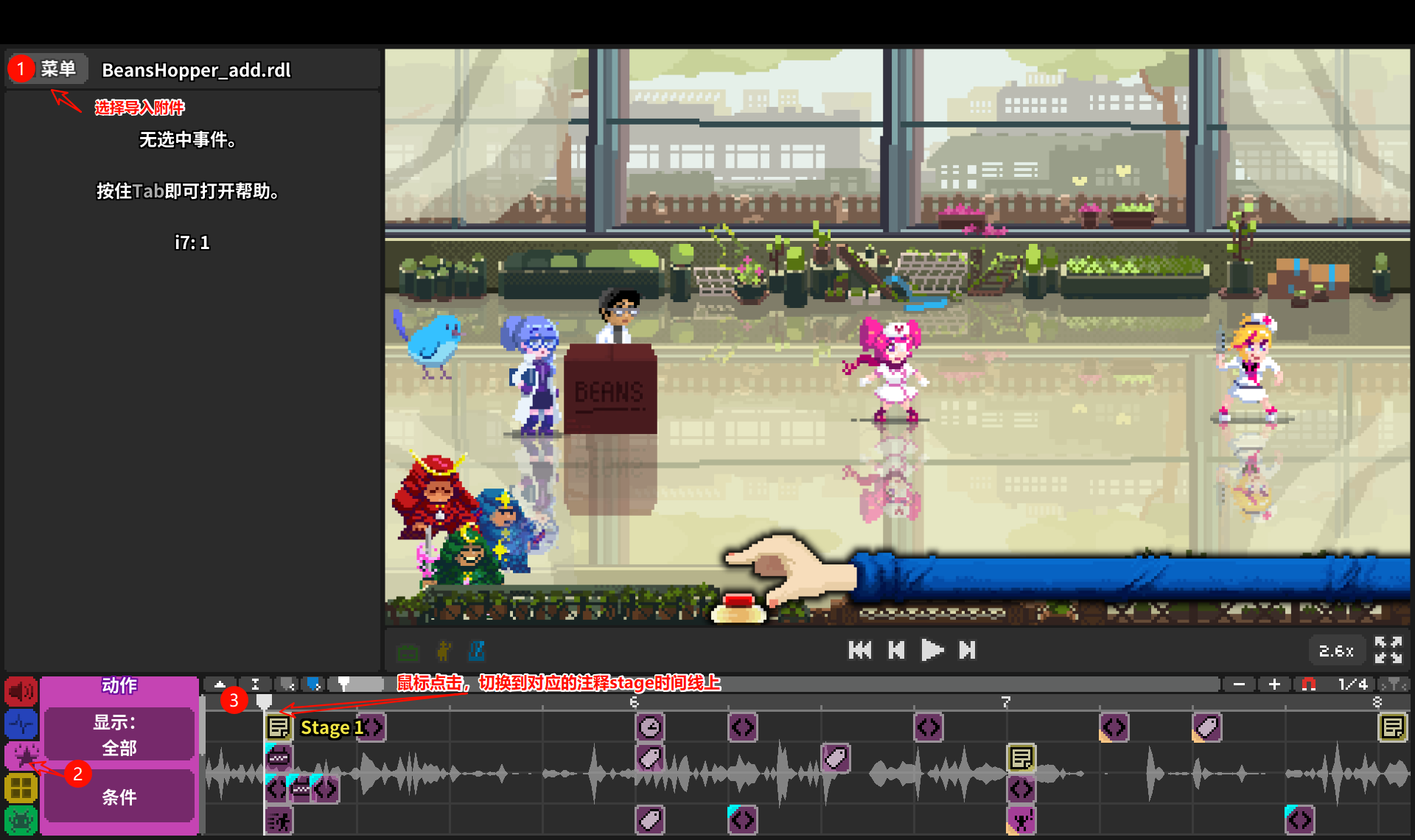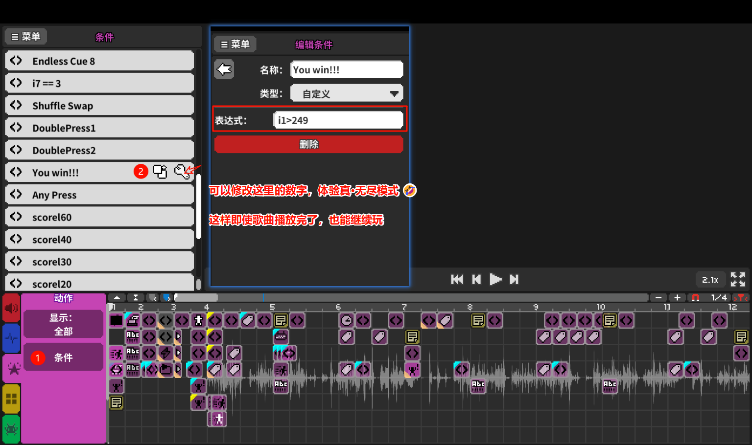- 为了应对不确定的时长的停顿拍,我在谱面文件中添加了“伊恩”的口令提示和即将进入的关卡分支提示,能比较好的提示你将面对的节奏变化;
