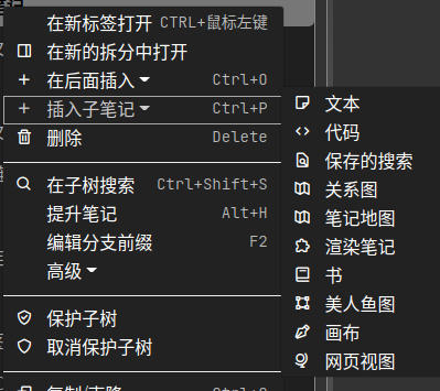你也可以在笔记树里点击右键,进行更详细的操作,创建不同类型的笔记