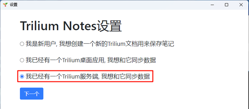 - Windows系统用户解压trilium-cn-windows-x64.zip免安装包后,双击运行trilium.exe客户端会弹出初始化设置界面,如下。只能选第三个才能与Trilium服务端同步。