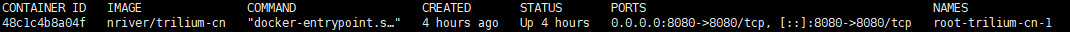 之前我们是用docker-compose 启动的Trilium,Compose 会自动把「目录名-服务名-序号」拼成容器名,所以NAMES变成了 root-trilium-cn-1