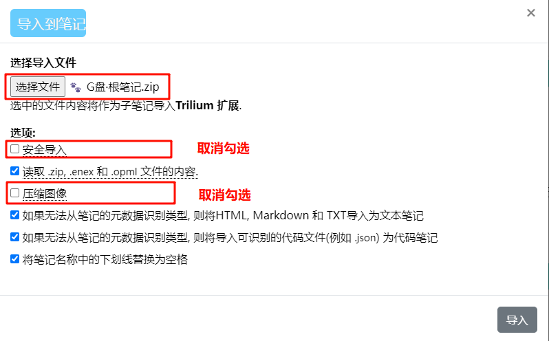 导入到笔记,取消勾选安全导入和压缩图像。(如果导入zip笔记遇到问题请看这篇文章)导入后F5刷新一下页面,点击左下角同步图标同步。
