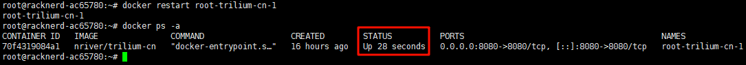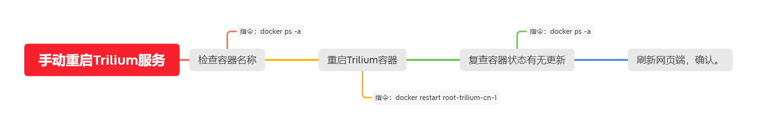 • 首先执行docker ps -a查看容器,看到 NAMES 列是 root-trilium-cn-1 或别的名字,就用那个名字重启: