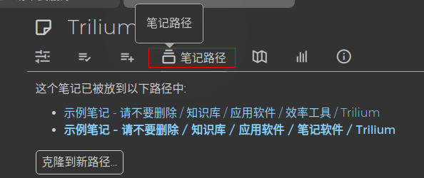 笔记克隆的好处是可以让一个笔记同时存在于多个节点下,比如 Trilium 这个笔记,可以分类到 笔记软件, 同时也可以归为 效率工具